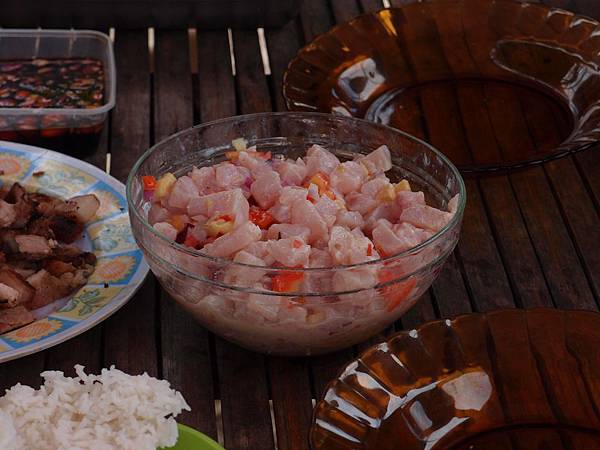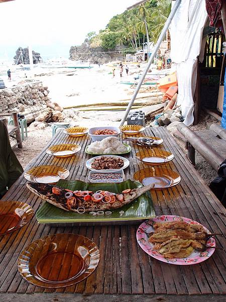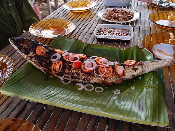 午餐有蝦、大烤魚、烤山豬肉、菲式沙西米、炸茄子