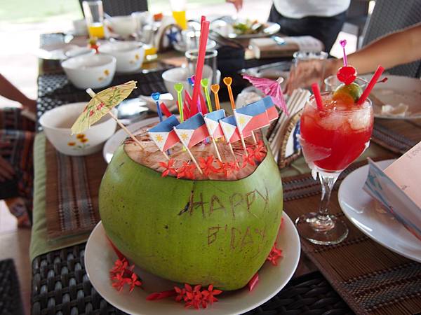 在早餐先送上了無敵大的繽紛造型生日椰子汁
